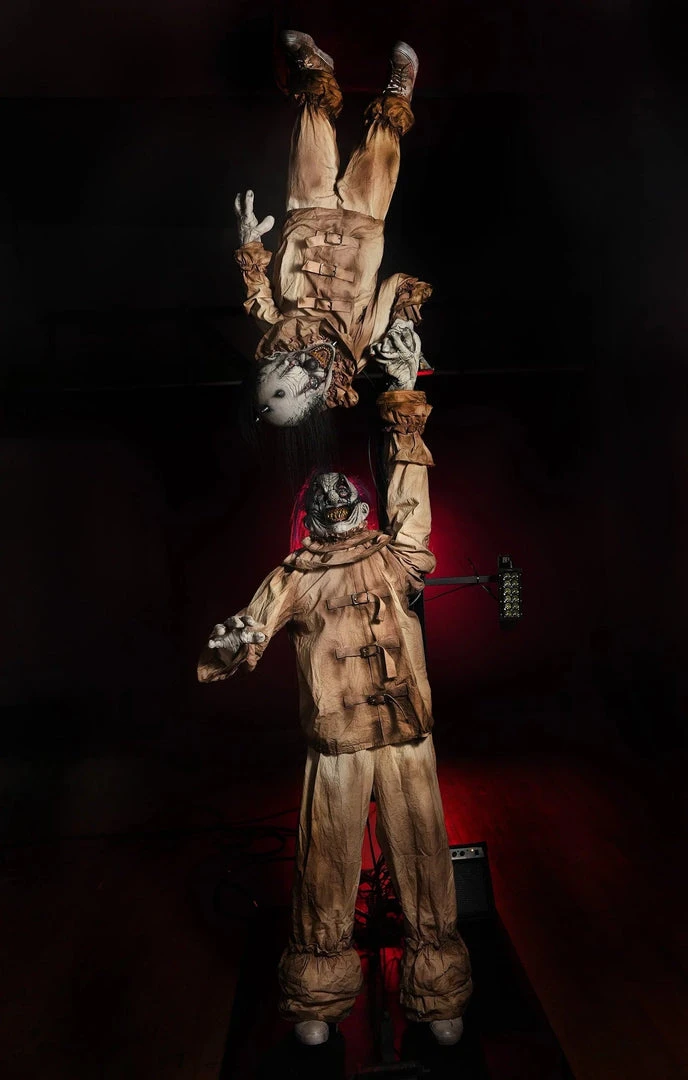 These two creepy circus clowns are having way too much fun as they entertain and terrify you! Creep Show is a professional animatronic prop perfect for demented clown scenes and haunts. This bizarre scene depicts a large clown attempting to balance a smaller clown above its head. “Little Creep” rocks back and forth, kicking its legs. Once Creep Show is triggered a surprise awaits as “Creep,” the large clown bolts forward to scare you and your guests. Creepiness, humor, and a scare all in one animatronic.