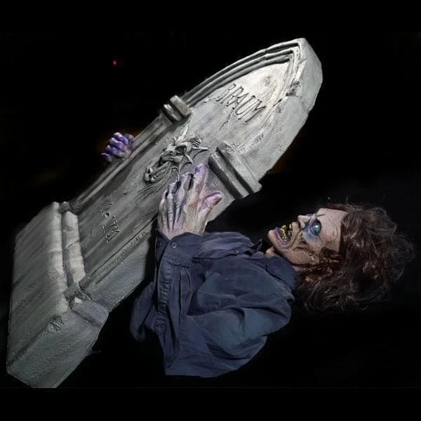 Dead Weight Tomb Prop. Static Zombie tombstone prop. Great Halloween decoration and prop for yard haunt. Clothing may vary.