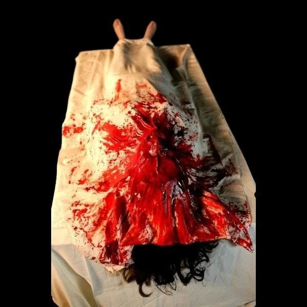 The Wakeup Dead animatronic from The Horror Dome is a pro-quality design that will have your visitors staring in disbelief. An all-electric animatronic, this unit is easy to set up, and doesn’t require a noisy air compressor. Just plug her in, and the body shakes and howls in agony. Create a backstory that includes a rash of vampire, werewolf, or zombie attacks in the area, or simply set a horrifying scene and let your guests fill in the blanks with their own imaginations. This life size prop features a white death shroud, soaked through with blood from what is probably a lethal head wound. Feet stick out one side, and hair protrudes from the other.