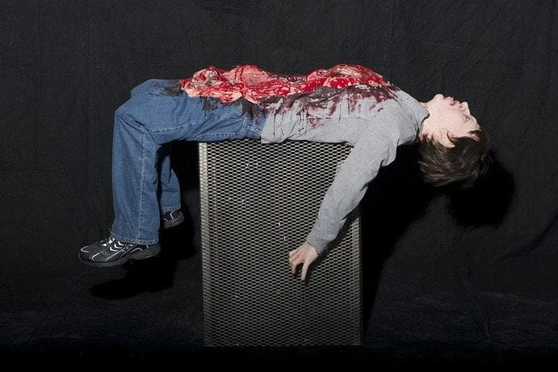 Full length animated body is gutted out. His head is slowly moving and legs are twitching. This Halloween Animtronic is designed to be filled with ‘blood’ and has a plastic container foamed into the body. Perfect addition to Bubba. Gruesome! Includes movement control, digital sound and speaker. Works great with our BUBBA Animatronic.
