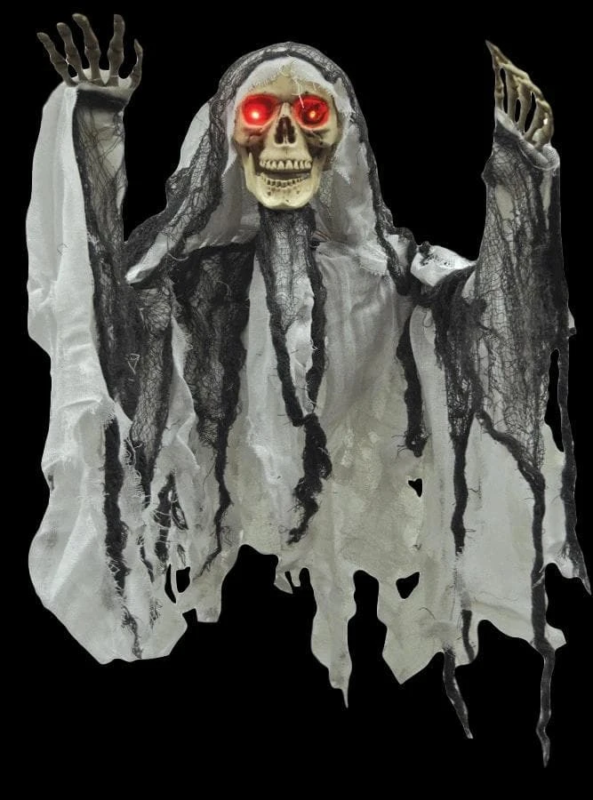 Hanging skeleton torso with light-up eyes and grey/white robe that will drift in the slightest breeze. Poseable arms. Size is 60in wide x 35in long x 7in depth. Requires 3LR44 cell size batteries not included.