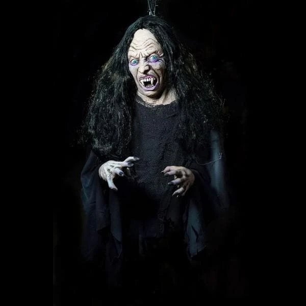 Blood Thirsty Vampire- The Blood Thirsty Vampire Halloween animatronic is perfect for a haunted house or holiday display centered around the popular vampire hunter theme. Custom made from high-quality materials, she’ll be a valued attraction, year after year. Gaze into her agonized eyes as she nears a slow and painful death.